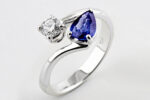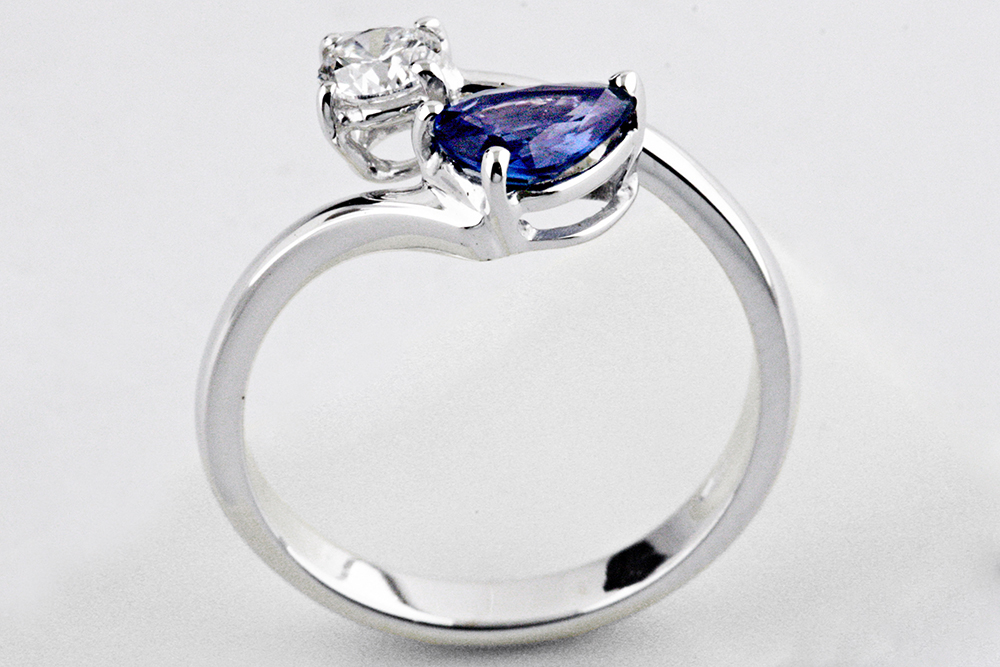 Anello in oro bianco 750 °/°° con uno zaffiro dal taglio a goccia del peso di ct. 0.82 e con un diamante taglio brillante del peso di ct. 0.20, colore F, purezza VS. Tutte le pietre sono naturali. Garanzia Biffigioielli.