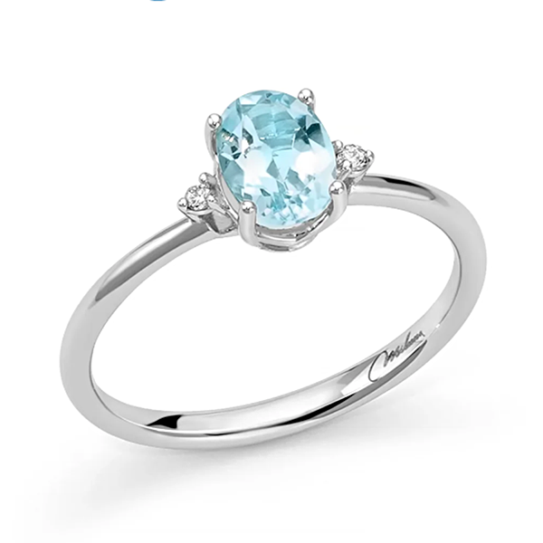 Anello Miluna in oro bianco 375 °/°° con un topazio azzurro naturale ovale del peso di ct. 1.00 e dei diamanti naturali taglio brillante del peso complessivo di ct. 0.0176, colore G, purezza SI. Garanzia Miluna.