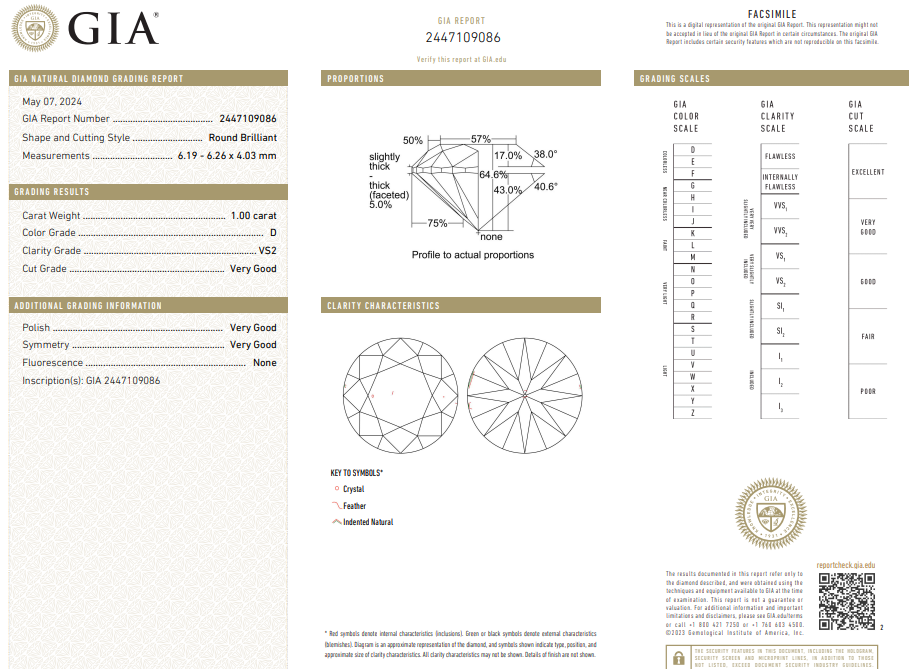 Diamante naturale taglio brillante – ct. 1.00, colore D, purezza VS2, taglio Very Good / Very Good/ Very Good . Accompagnato da certificato internazionale GIA con numero inciso a laser sulla pietra (Laserscribe).