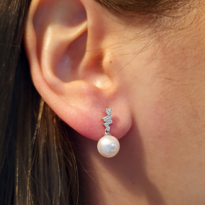 Gli orecchini realizzati in oro con perle coltivate e diamanti esprimono un’eleganza misurata e luminosa. La perla, simbolo di purezza e raffinatezza, viene valorizzata dalla presenza del diamante, che aggiunge brillantezza senza mai risultare eccessiva.