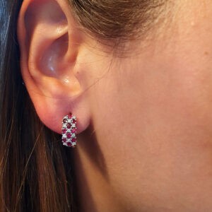 Lo stesso vale per le montature: oro bianco, giallo e rosa possono convivere nello stesso orecchino, dando vita a contrasti raffinati. Un cerchio in oro rosa con piccoli diamanti bianchi, per esempio, può essere abbinato a un punto luce in oro bianco con diamante nero, creando un effetto equilibrato e moderno. Non si tratta soltanto di un dettaglio estetico, ma di un vero e proprio modo per raccontare il proprio stile attraverso un gioiello.