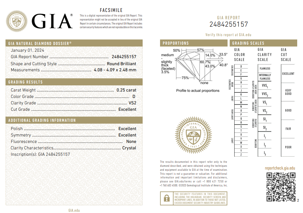 Orecchini punti luce in oro bianco 750 °/°° con due diamanti naturali taglio brillante del peso di ct. 0.25 ciascuno. Entrambi di colore D, purezza VS2, dal taglio Excellent, Excellent/Very Good, Very Good . Entrambi i diamanti sono corredati da certificato internazionale GIA e incisione laserscribe del numero di certificato sulle pietre. Garanzia Biffigioielli.