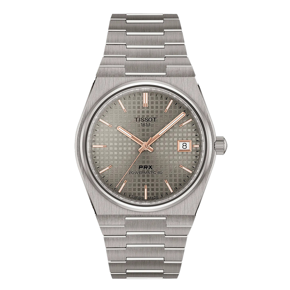 Orologio Tissot PRX Powermatic 80 collezione “T-Classic” da uomo. Movimento meccanico automatico Swiss Made con riserva di carica fino a 80 ore. Cassa, piatta a forma di tonneau (38 mm) e fondello con movimento a vista. Bracciale in acciaio 316L con chiusura a farfalla con pulsanti. Quadrante di colore antracite con datario. Lancette rivestite in Super-LumiNova®. Vetro zaffiro antigraffio con trattamento antiriflesso. Impermeabilità: 10 bar. Garanzia: 2 anni.